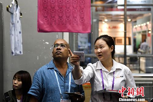 10月15日,参展商为采购商介绍产品性能。当日,第122届中国进出口商品交易会在广州开幕,吸引了来自境内外2.5万余家企业携带超过16万种商品前来参展。 中新社记者 陈骥旻 摄