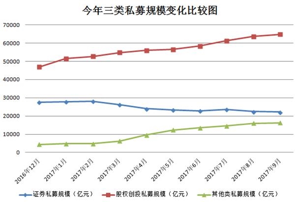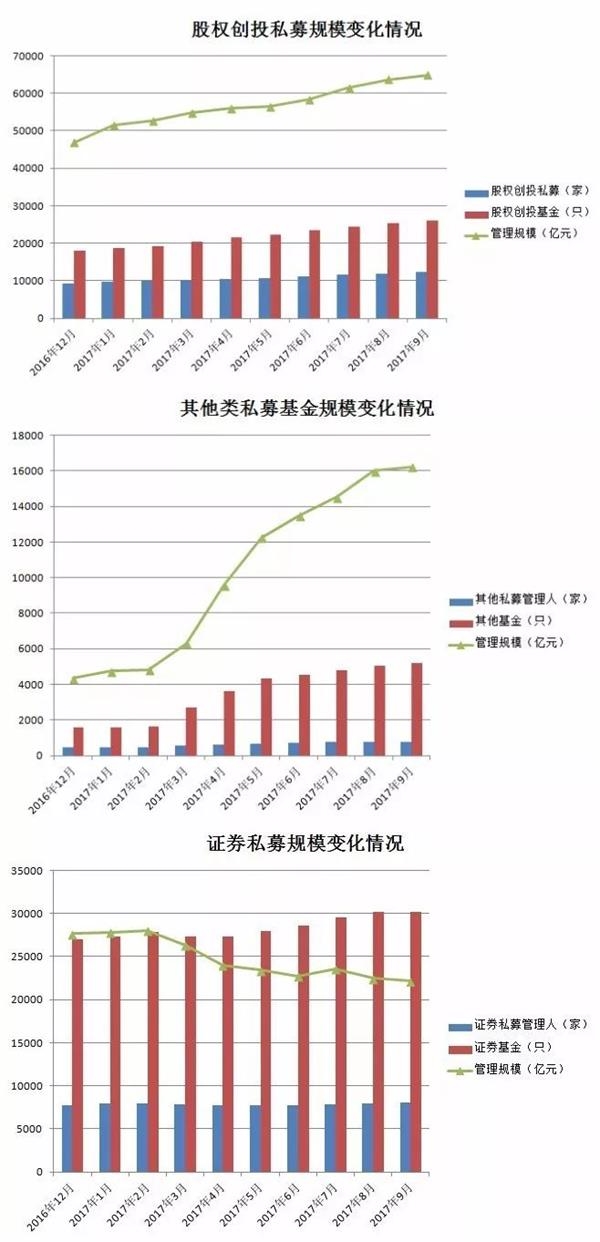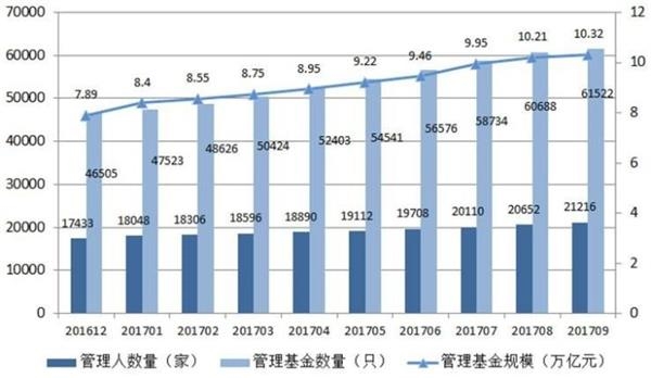 在总规模突破10万亿以后,9月份私募规模增长却陷入了低迷期。基金业协会数据显示,截至2017年9月底,私募管理基金规模10.32万亿元。