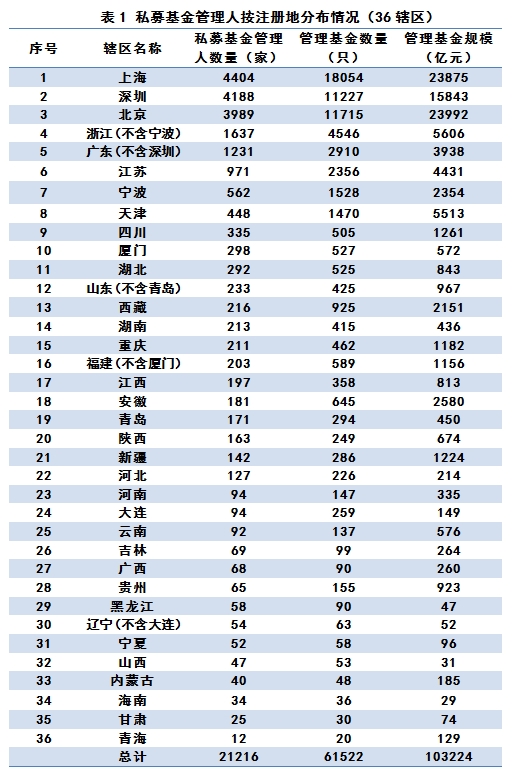 从私募基金的地域分布来看,上海、深圳、北京依旧是三足鼎立,上海4404家、深圳4188家、北京3989家。