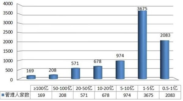 基金君发现,在规模以上的私募中,1-5亿这一段是最多的,有3675家,其次是0.5-1亿这一段有2083家,可见小私募仍然是业内主流,大私募较少,行业呈现二八分化现象。