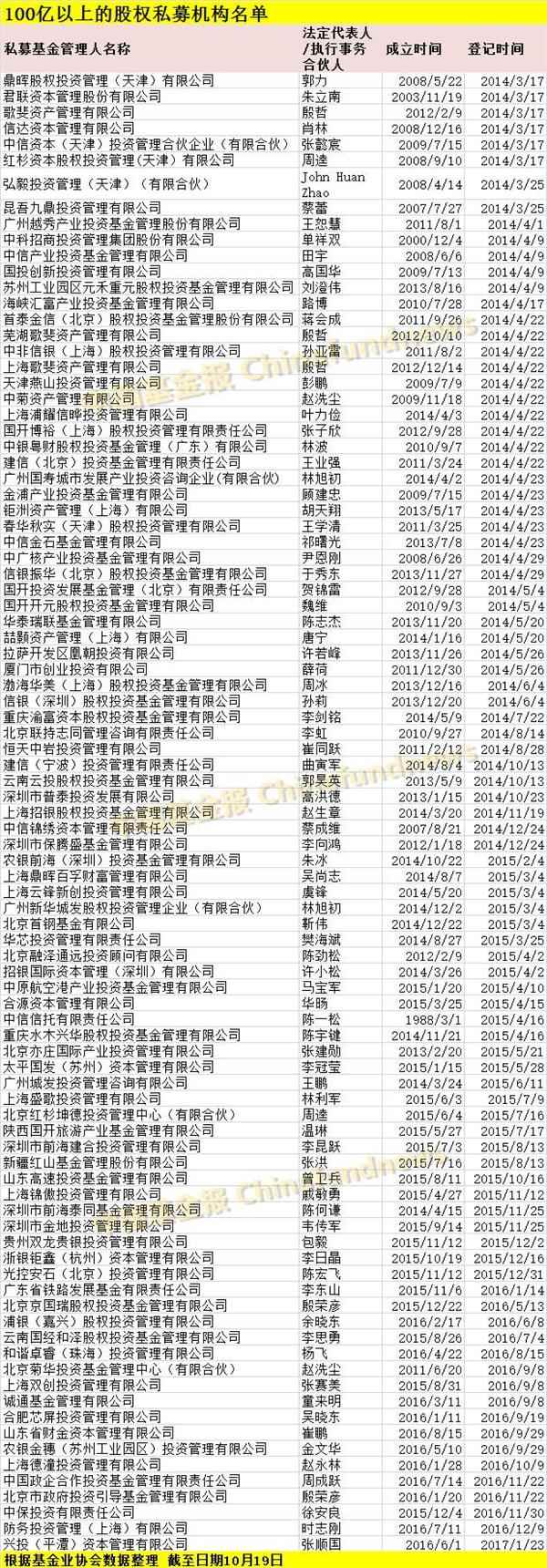 同时,协会数据显示,截至10月19日,100亿以上的股权私募基金减少到92家,包括鼎晖股权投资、君联资本、歌斐资产、信达资本、红杉资本、中信产业投资基金等业内实力雄厚的股权私募机构。