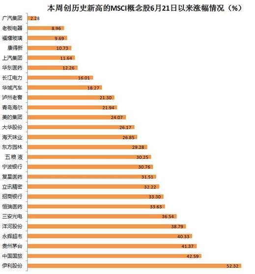 上述3只投资者耳熟能详的股票,都具有一个共同的特征:MSCI概念股。数据显示,本周共计有26只MSCI概念股创出历史新高,自6月21日以来,伊利股份、中国国旅以及贵州茅台涨幅居前。