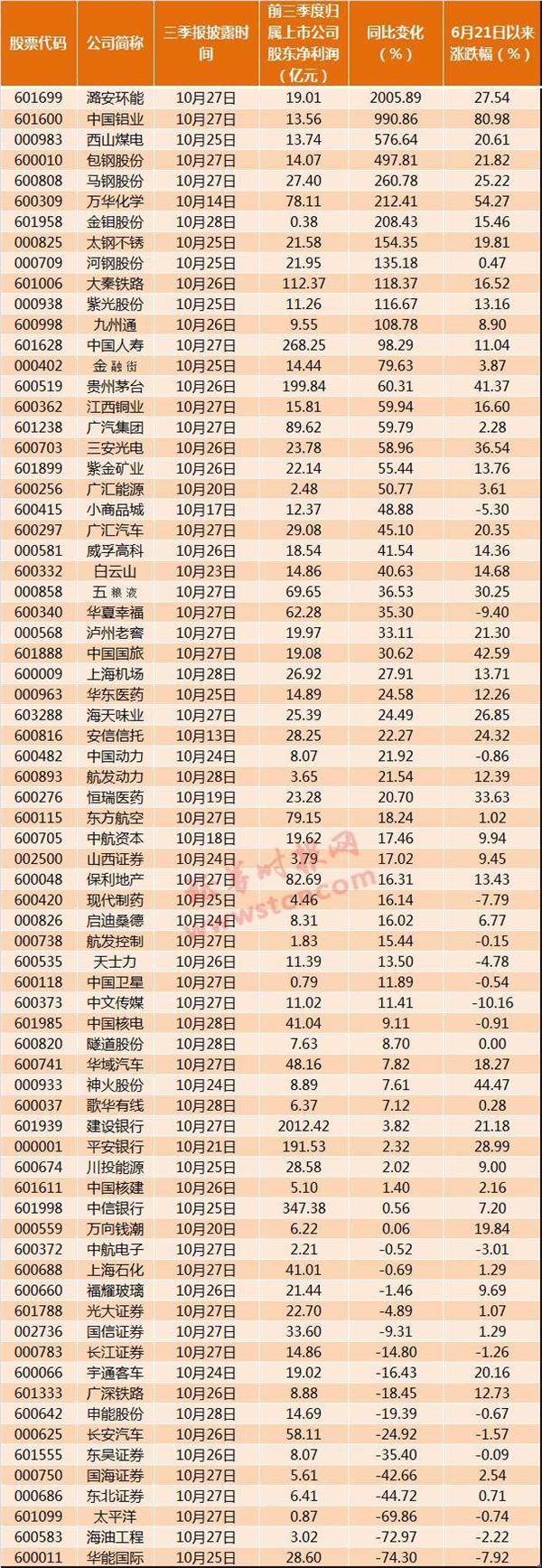 中国铝业、西山煤电、包钢股份、马钢股份、万华化学、金钼股份、太钢不锈、河钢股份、大秦铁路、紫光股份和九州通等12股前三季度归属上市公司股东净利润同比增长超100%。而东吴证券、国海证券、东北证券、太平洋、海油工程和华能国际等6股前三季度归属上市公司股东净利润则同比下滑超30%。