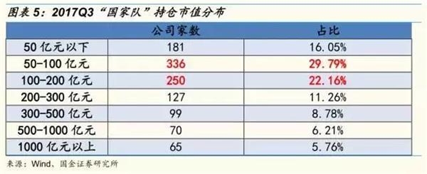 “国家队”持股公司的市值分布主要集中在“50-100 亿、100-200 亿”。
