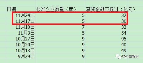 11月24日晚,证监会按惯例公布核发IPO批文,5家公司获批,筹资总额不超过32亿元。为什么我们要提这个数据呢?看一下下面的表格你就会明白。