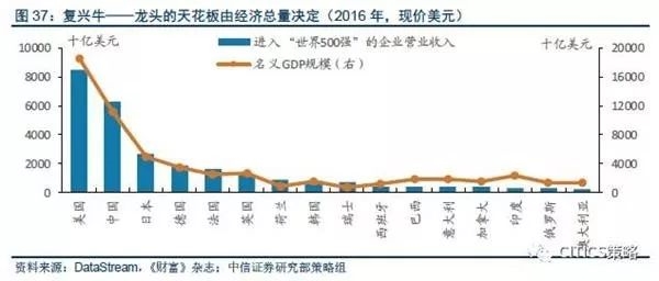 中信证券认为,龙头将领涨A股。该机构报告称,一个经济体内的大公司,或者说行业龙头,其稳态增速和天花板实际上取决于他们所处的经济体的经济总量。该机构把2016年“财富500强”的营业收入按照其所属经济体加总,其排序和规模与经济体的名义GDP规模高度相关。