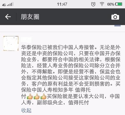 今日有消息称“华泰已被保监会指定由中国人寿接管”,并在微信朋友圈传播。华泰保险发布郑重声明称,此消息系谣言。华泰保险在声明中称,上述谣言经传播后,对华泰保险的业务和声誉造成了重大负面影响,华泰保险目前正常经营,集团旗下财险、寿险等业务经营状况良好。
