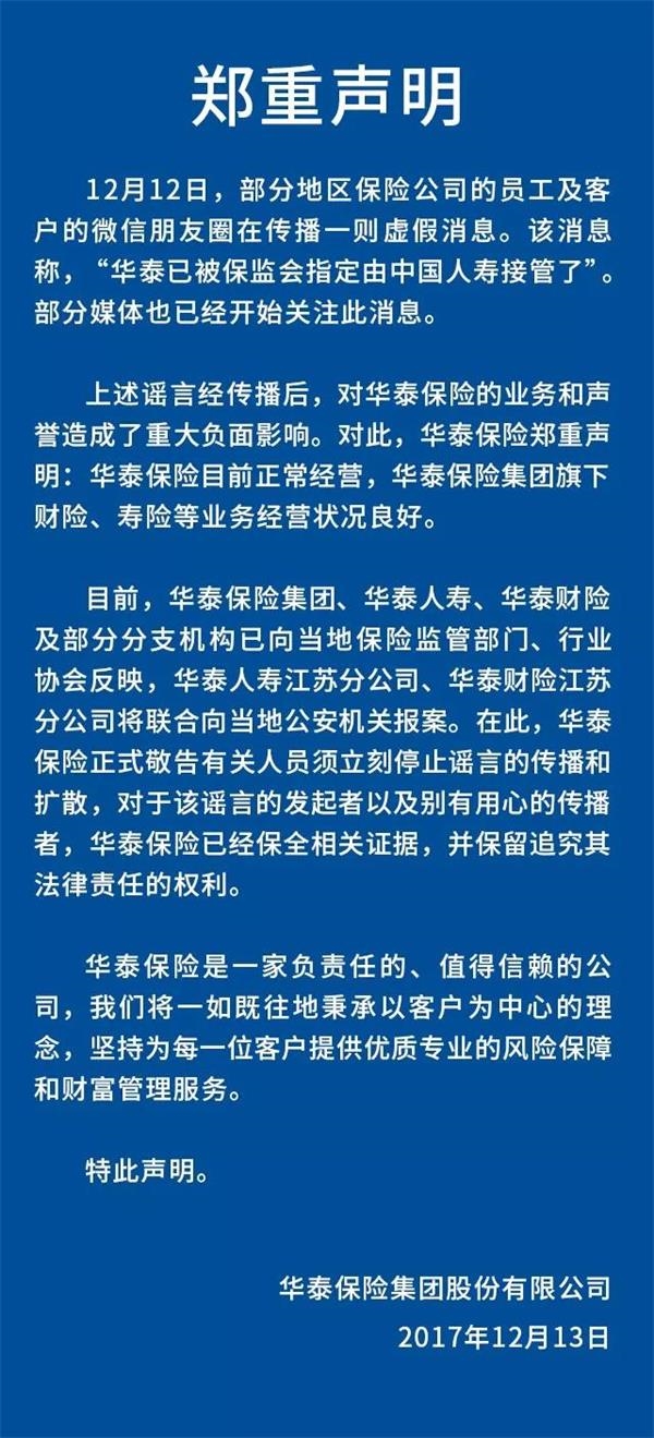 12月13日,华泰保险通过其官方公众号发布声明称,“华泰已被保监会指定由中国人寿接管”系谣言。