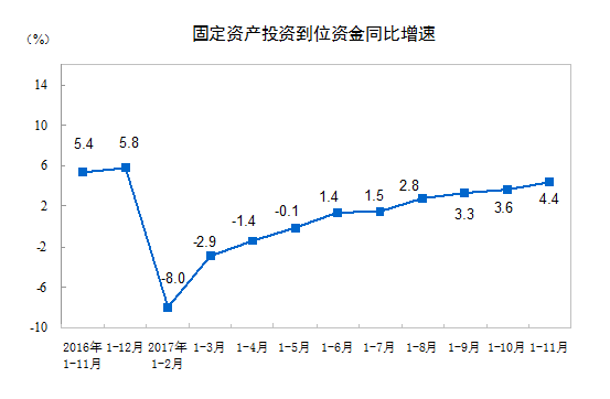 2017年1-11月份,全国固定资产投资(不含农户)575057亿元,同比增长7.2%,增速比1-10月份回落0.1个百分点。从环比速度看,11月份比10月份增长0.53%。