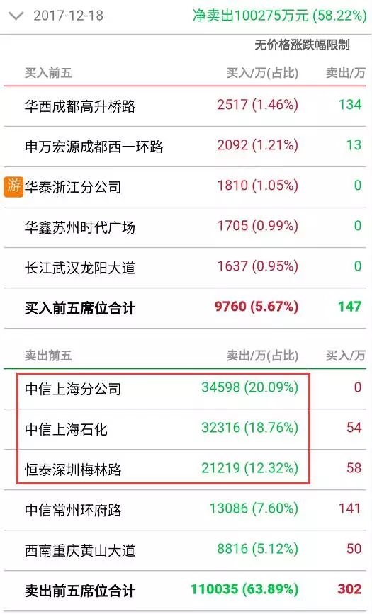 盘后数据也验证了这一点,18日逾50%的卖单源自三家营业部,分别是中信证券上海分公司、中信证券上海石化营业部、恒泰证券深圳梅林路营业部,分别卖出3.46亿元、3.23亿元、2.12亿元。