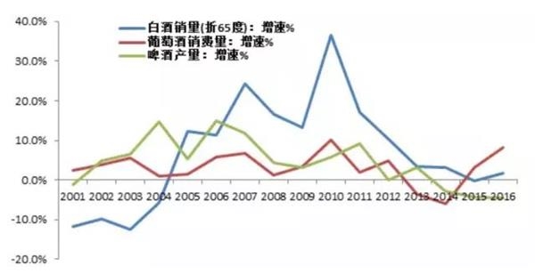 这些年来,除了红酒销量增速回升外,白酒和啤酒的销量增速都在回落,红酒的消费以高收入群体为主,白酒和啤酒的消费主体则是中低收入群体。