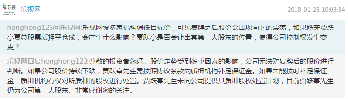 中国证券网讯(记者 王子霖)在23日上午举办的乐视网投资者说明会上,公司表示,如果公司股价持续下跌,贾跃亭需按照协议条款向质押机构补足保证金。如果未能按时补足保证金,质押机构有权对所质押的股权进行处置。贾跃亭未向公司提供其质押股权处置计划,目前贾跃亭仍为公司第一大股东。