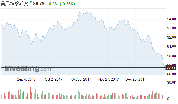 1月25日,跌破90关口后的美元仍然尽显颓势,在重要关口失守后进一步加速下跌,并于早盘跌破89关口,创下2014年1月以来新低,盘中最低跌至88.8048,截至当日14:38,报88.83附近。