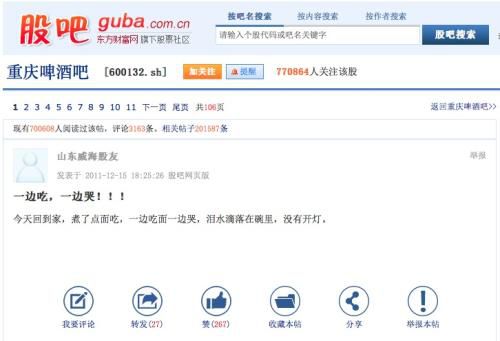 2011年12月15日,在经历了连续第6个一字跌停的晚上,一名网友在重庆啤酒股吧发表了一篇题为《一边吃,一边哭》的帖子,帖子内容只有简短的一句话——今天回到家,煮了点面吃,一边吃面一边哭,泪水滴落在碗里,没有开灯。