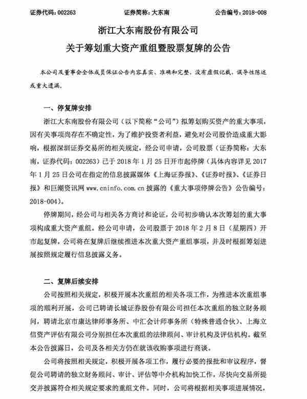 8日当天科林环保(002499.SZ)、南风化工(000737.SZ)、大东南(002263.SZ)三家谋划重大资产重组的深市企业复牌;而*ST东海A(000613.SZ)尚在“筹划重大事项”阶段,就同时申请复牌。值得玩味的是,三家公司在复牌公告中仍未披露交易对方详情以及交易手段;截至公告披露日,双方与相关方仍在围绕收购进行商谈或尽调!