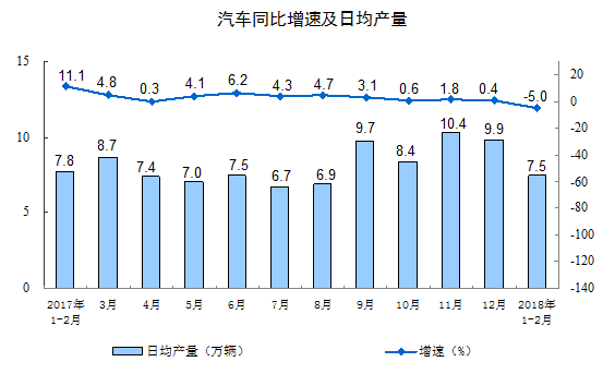 分产品看,1-2月份,596种产品中有384种产品同比增长。其中,钢材15903万吨,同比增长4.6%;水泥22256万吨,增长4.1%;十种有色金属886万吨,增长1.9%;乙烯281万吨,下降1.5%;汽车441.8万辆,下降5.0%;轿车178.8万辆,下降5.8%;发电量10455亿千瓦时,增长11.0%;原油加工量9340万吨,增长7.3%。