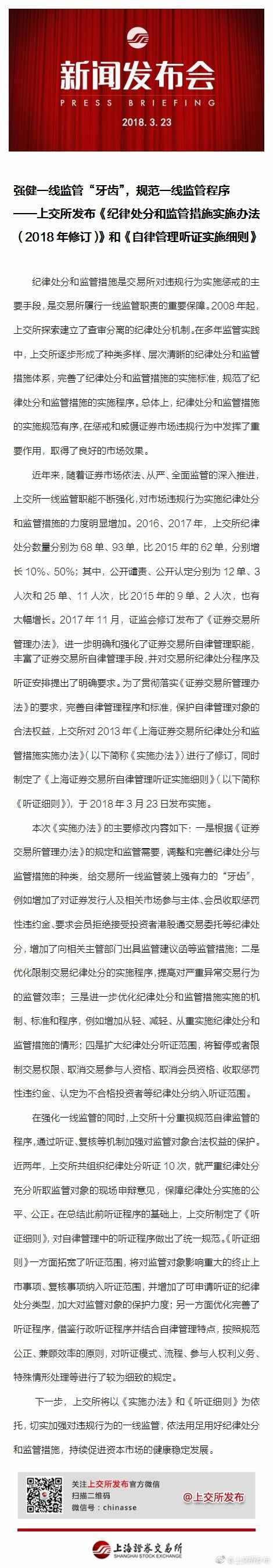 中证网讯 上交所官方微博3月23日发布《纪律处分和监管措施实施办法(2018年修订)》和《自律管理听证实施细则》。上交所表示,在多年监管实践中,逐步形成了种类多样、层次清晰的纪律处分和监管措施体系,完善了纪律处分和监管措施的实施标准,规范了纪律处分和监管措施的实施程序。下一步将切实加强对违规行为的一线监管,依法用足用好纪律处分和监管措施,持续促进资本市场的健康稳定发展。