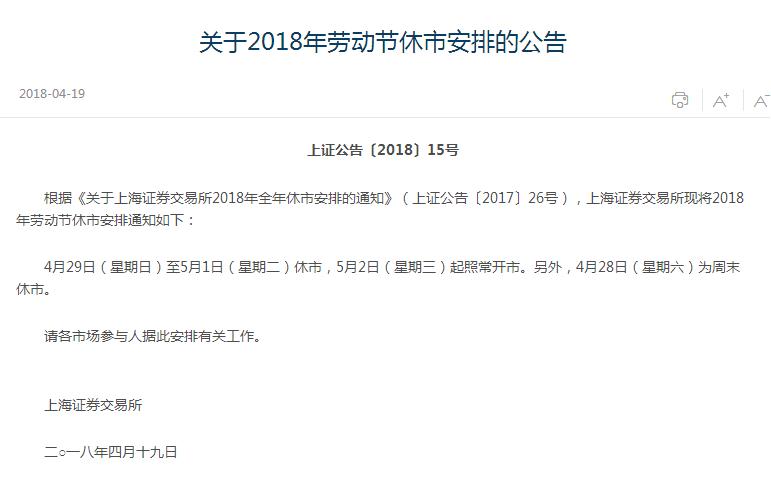 编者按:4月19日分别从上交所、深交所网站获悉,上交所、深交所公告今年劳动节期间休市安排,4月29日(星期日)至5月1日(星期二)休市,5月2日(星期三)起照常开市。另外,4月28日(星期六)为周末休市。