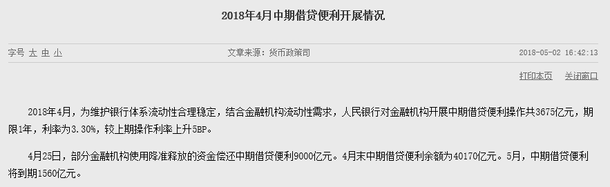 中证网讯 央行网站5月2日消息,4月央行对金融机构开展中期借贷便利操作共3675亿元,期限1年,利率为3.30%,较上期操作利率上升5BP。5月,中期借贷便利将到期1560亿元。