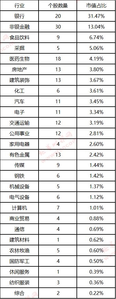 分行业来看,属于银行、非银金融、医药生物等3大行业的公司数量最多,分别为30家、20家、18家。从公司市值占比来看,最高的属于银行业,占比高达31.47%、其次是非银金融,占比达13.04%,食品饮料排第三,占比为6.74%。