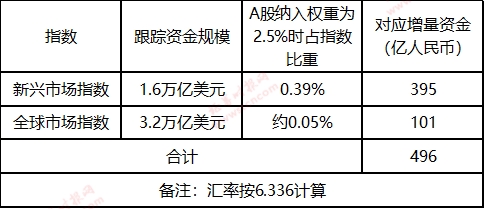 根据MSCI公布的数据,跟踪MSCI新兴市场指数以及全球市场指数投资的资金规模大约分别在1.6万亿和3.2万亿美元。。另外,新兴市场指数所跟踪的标的,约占MSCI的全球市场指数所跟踪标的市值的12%,因此可以推算出大约有496亿人民币资金可能会因跟踪MSCI指数而流入A股市场