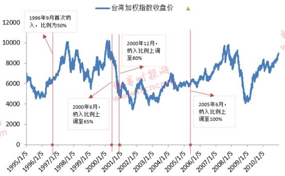台湾:从1996年4月2日首次传出台股将纳入MSCI新兴市场指数到9月3日正式纳入,台湾股市出现一波上涨,涨幅为20.9%;1996年首次纳入和2005年全部纳入后,台湾股市均出现了一波上涨,但是在2000年纳入比例连续上调的过程中,台湾股市则连续下跌。