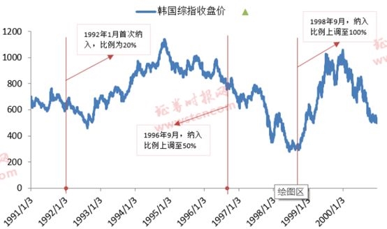 韩国:1992年,韩国综指在初始纳入时出现过短期上涨,其后便出现回调;1996年,韩国综指纳入比例上调至50%,但是韩国综指缺出现连续下跌;到了1998年,纳入比例上调至100%后,韩国综指则出现一轮较好的上涨行情。