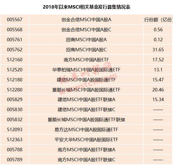 其中,2018年以来,直接以MSCI为名的基金已成立6只,至认购截止日共募集到114.22亿元。此外,还有超过10只MSCI基金“整装待发”。