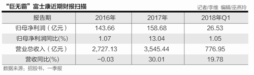 一季报显示,富士康2018年一季度的营业收入、归母公司净利润分别为776.95亿元和26.53亿元,同比增长19.78%和4.53%。