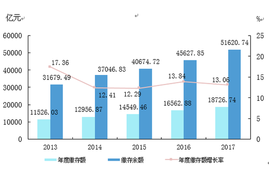2017年,住房公积金缴存额18726.74亿元,比上年增长13.06%。