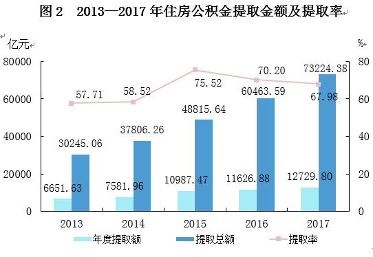 (二)基本住房消费支持有力。2017年,住房租赁提取金额444.76亿元,同比增长22.21%;住房租赁提取人数495.52万人;人均提取金额0.9万元。