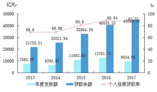 2017年末,住房公积金个人住房贷款率87.27%,比上年回落1.57个百分点;个人住房贷款市场占有率[14]17.06%。