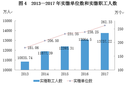 (一)缴存。2017年,住房公积金实缴单位262.33万个,实缴职工13737.22万人,分别比上年增长10.11%和5.15%。新开户单位37.69万个,新开户职工1828.28万人。