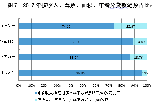 2017年发放的个人住房贷款中,中、低收入群体占96.05%,比上年增加1.23个百分点;首套住房贷款占86.24%,比上年增加2.73个百分点;144(含)平方米以下普通住房贷款占89.20%,比上年减少1.07个百分点。