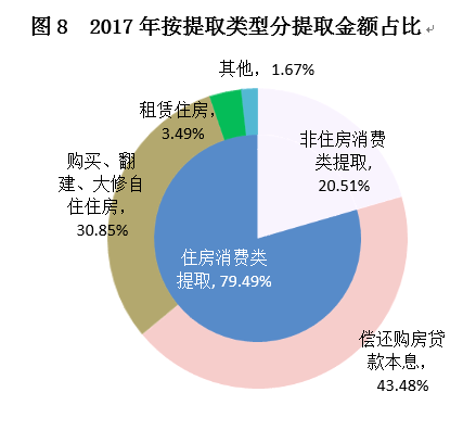 (三)职工住房消费负担减轻。2017年,住房公积金住房消费类提取占当年提取额的79.49%。