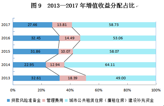 (五)支持保障性住房建设。2017年,提取城市公共租赁住房(廉租住房)建设补充资金占当年增值收益的59.43%。2017年末,累计为城市公共租赁住房(廉租住房)建设提供补充资金2904.59亿元。