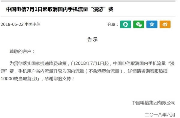 中国电信也在其官方网站宣布,自2018年7月1日起,中国电信取消国内手机流量“漫游”费,手机用户省内流量升级为国内流量(不含港澳台流量)。