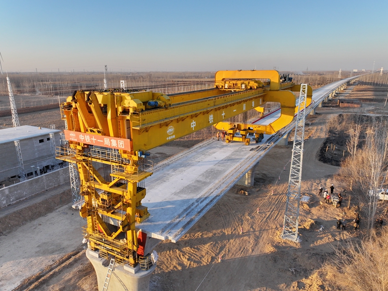 1月16日,中铁十一局集团架桥机在雄商高铁站前六标段最后一孔箱梁架设现场作业(无人机照片)。