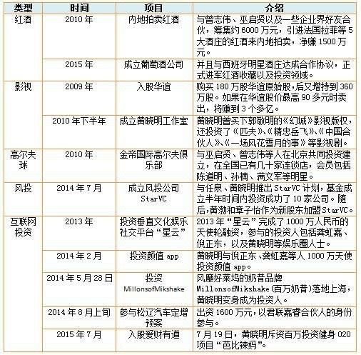 黄晓明一直对红酒情有独钟,曾找来曾志伟、巫启贤等好友合伙,筹集了约6000万元,引进法国拉菲等5大酒庄的红酒来大陆拍卖,一年就把投资全数收回。他还独自花100余万元买了一批红酒,囤了8个月后卖掉,净赚1500万元。