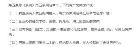 《细则》称,四类房产将可免纳房产税,一为安置残疾人就业的纳税人,可按有关规定减征或者免征房产税;二为企业办的各类学校、医院、托儿所、幼儿园自用的房产;三为经有关部门鉴定,对毁损不堪居住和危险房屋,在停止使用后,可免征房产税;四为房屋大修停用半年以上的,经纳税人申请,在大修期间可免征房产税。