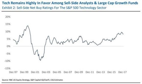 在买方市场,大盘股下的共同基金继续青睐配置超配的科技股。Calvasina指出,2018年尽管科技股的配置比重低于2016年创下的高点,但仍高于长期平均水平。