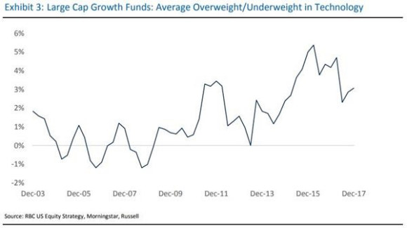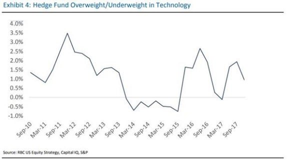 另外值得警醒的是,对冲基金在2017年最后一个季度削减了科技股的配置分额,但在2018年初看来仍然超配。