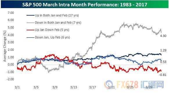 下图为1983-2017年标普500指数3月的月内表现。从图中可以看出,标普500指数有17年在1月和2月均上涨,有7年在1月和2月均下跌,有5年在1月上涨2月下跌,在1月下跌2月上涨的年份为6年。