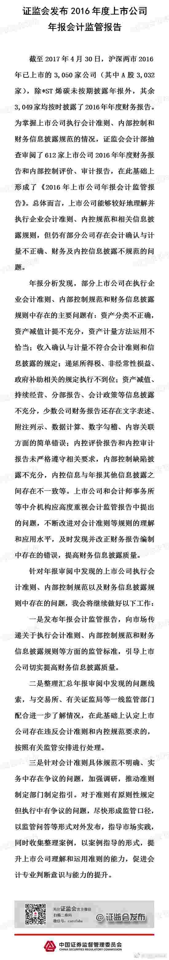中证网讯(记者 徐昭) 中国证监会新闻发言人高莉14日表示,证监会近日发布了2016年上市公司年报会计监管报告。证监会会计部通过抽查审阅了612家上市公司2016年财报及内控报告,总体而言,上市公司能够较好地理解会计准则及内控等规则。同时,也存在资产分类不正确、政府补助相关规定执行不到位等问题。其中,少数公司财报还存在文字表述数据计算等简单错误。