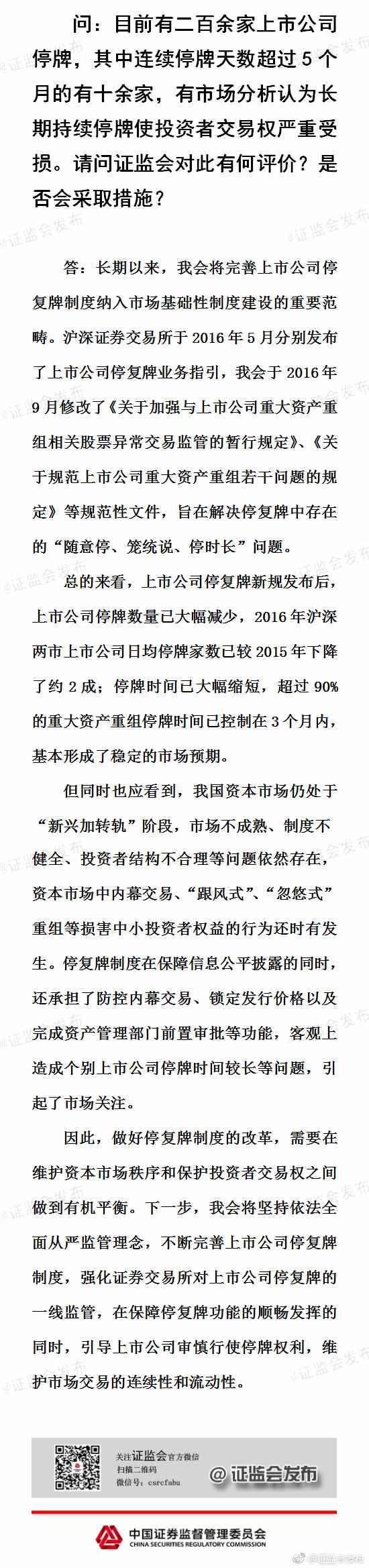 中证网讯(记者 徐昭)中国证监会新闻发言人常德鹏28日回应“上市公司长期停牌行为”时表示,证监会下一步将做好停复牌制度改革工作,将不断完善停复牌制度,引导上市公司审慎使用停复牌制度,维护市场交易连续性和流动性。