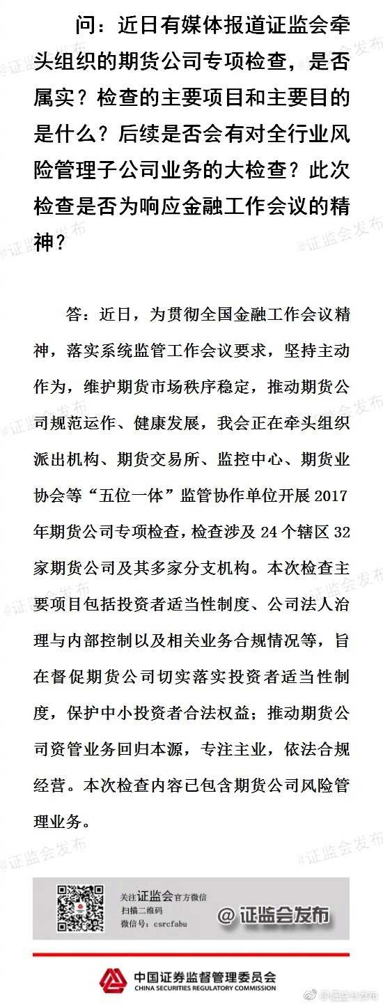 中证网讯(记者 徐昭)中国证监会新闻发言人常德鹏28日回应“证监会牵头组织期货公司专项检查事项”时表示,证监会此次检查涉及期货公司投资者适当性制度、风险管理、内部控制等方面,旨在督促期货公司落实投资者适当性管理办法,推动期货公司回归主业,规范运营。