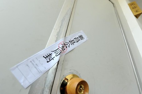 (4月16日,涉嫌使用工业明胶制作空心胶囊的卓康胶囊有限公司内部,化验室门口贴有新昌县公安局的封条)