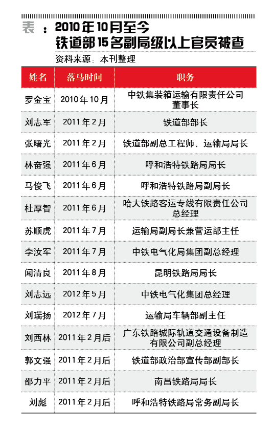原铁道部部长刘志军自2011年2月被免职接受调查已超过一年半,其后,铁路系统不断“蹦出”涉嫌违纪和腐败的官员,迄今已有15名副局级以上干部落马。
