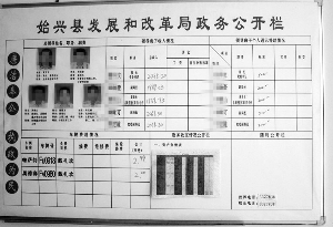 在始兴县多个部门办公区的“政务公开栏”,都可以看到部门负责人的工资情况,这种做法已实行多年,但对外部监督缺乏意义,社会等待公开的不仅是法定工资,还包括实际收入和家庭财产,而这正是此次试点的内容。(罗峰/摄)