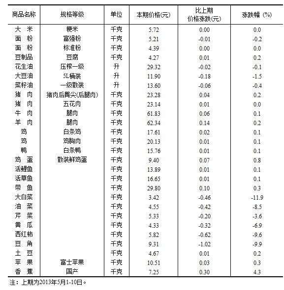 中国证券网讯(记者 郭晓萍)国家统计局24日公布50个城市主要食品平均价格变动情况(2013年5月11-20日)。监测的27种食品中,10种价格环比下跌,其中大白菜价格跌幅最大,达11.9%,豆角、西红柿紧随其后。